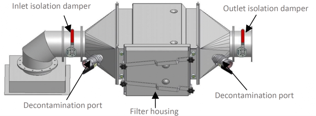- Decontamination before any filter change is essential Normally, the filter and BIBO housing is decontaminated using either Formaldehyde or Vaporized Hydrogen Peroxide (VHP) through the port The inlet and outlet isolation dampers are closed and the fumigation media circulated around the BIBO housing and HEPA filter for the specified time